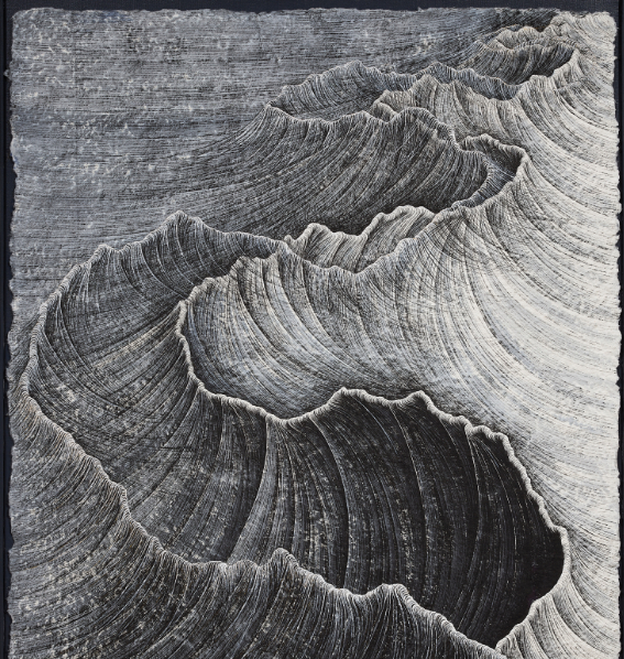 Lee Hyung Joung Born in South Korea and based in Paris, Lee Hyung Joung holds a license in Fine Arts from Sejong University and is trained in goldsmithing. Her work reflects her childhood memories and utilizes traditional Korean materials, specifically Hanji, ink and pigments. Rather than flattening the paper, she allows random embossed designs to appear, using her brush to create rhythmic patterns that emphasize or impede the natural relief of the material without a structured plan.